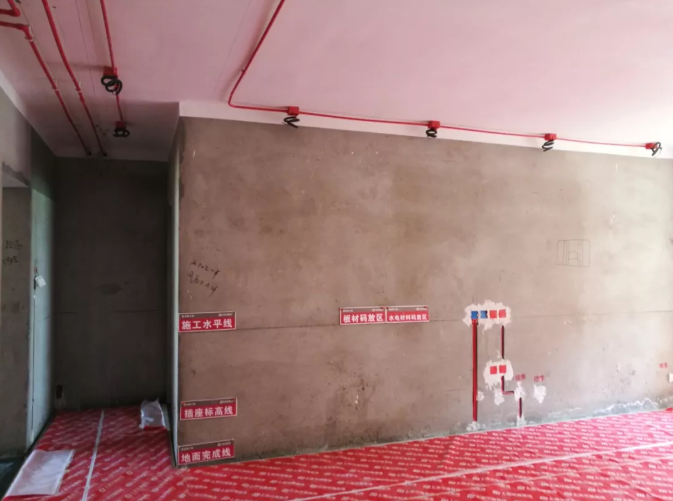 (注:華埔裝飾工地在水電走線環節有著嚴格的施工標準和要求,水路要求上翻頂面施工,減少接頭,方便后期維修。水電管線要做到橫平豎直,強弱電交叉位置鋁箔紙做抗干擾保護。完工要做關卡固定,線路保護。)