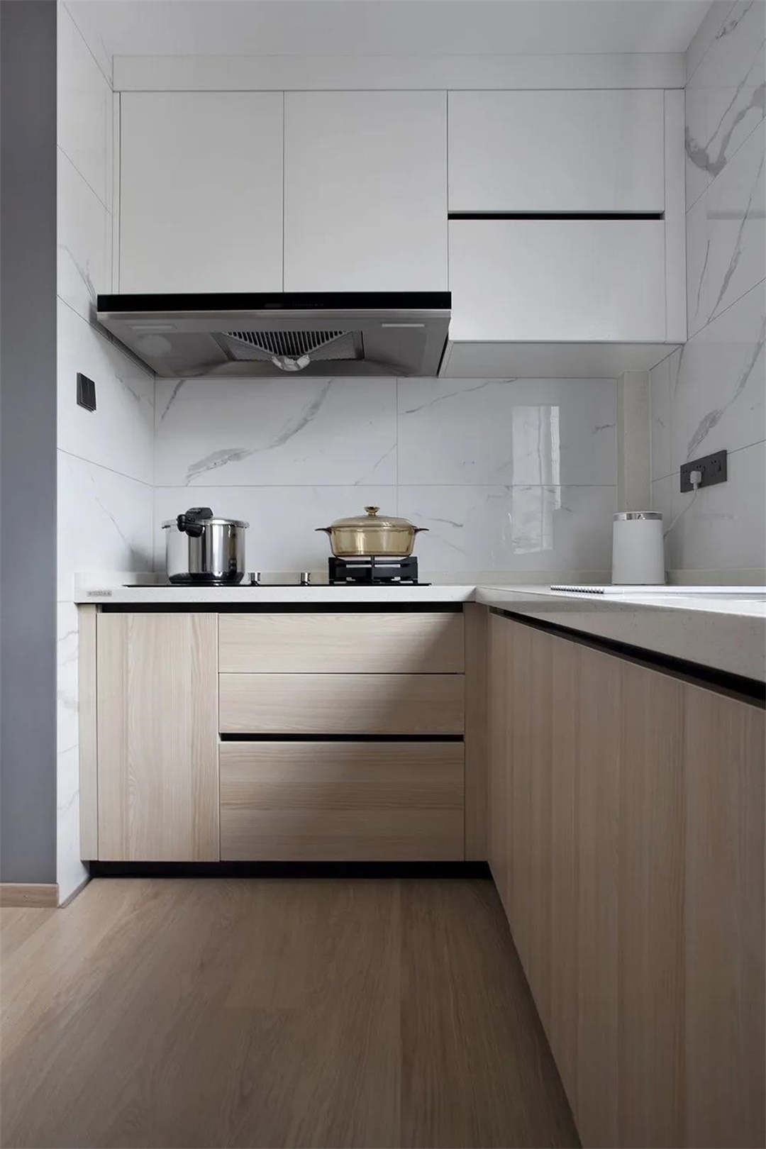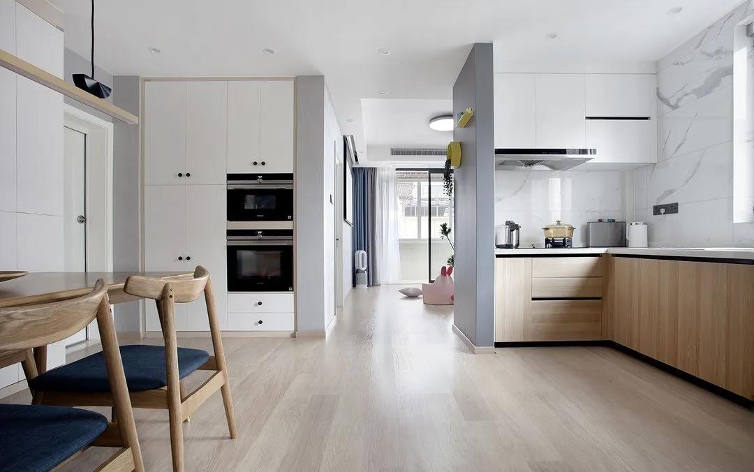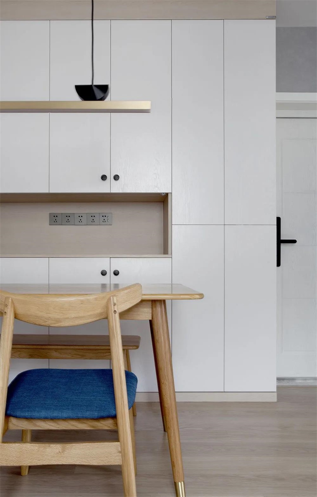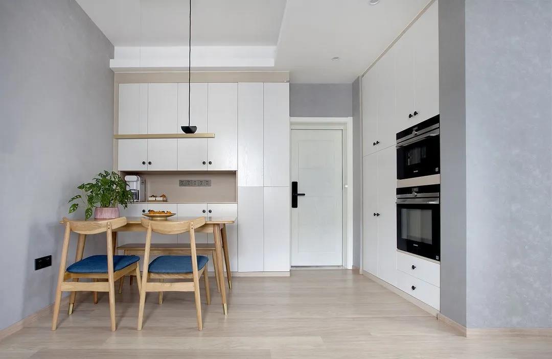 經過玄關就是餐桌,用高柜做隔斷,也方便收納。餐廳一側做全墻式收納柜,烤箱電器做鑲嵌收納處理,不占位置,更加美觀簡潔。