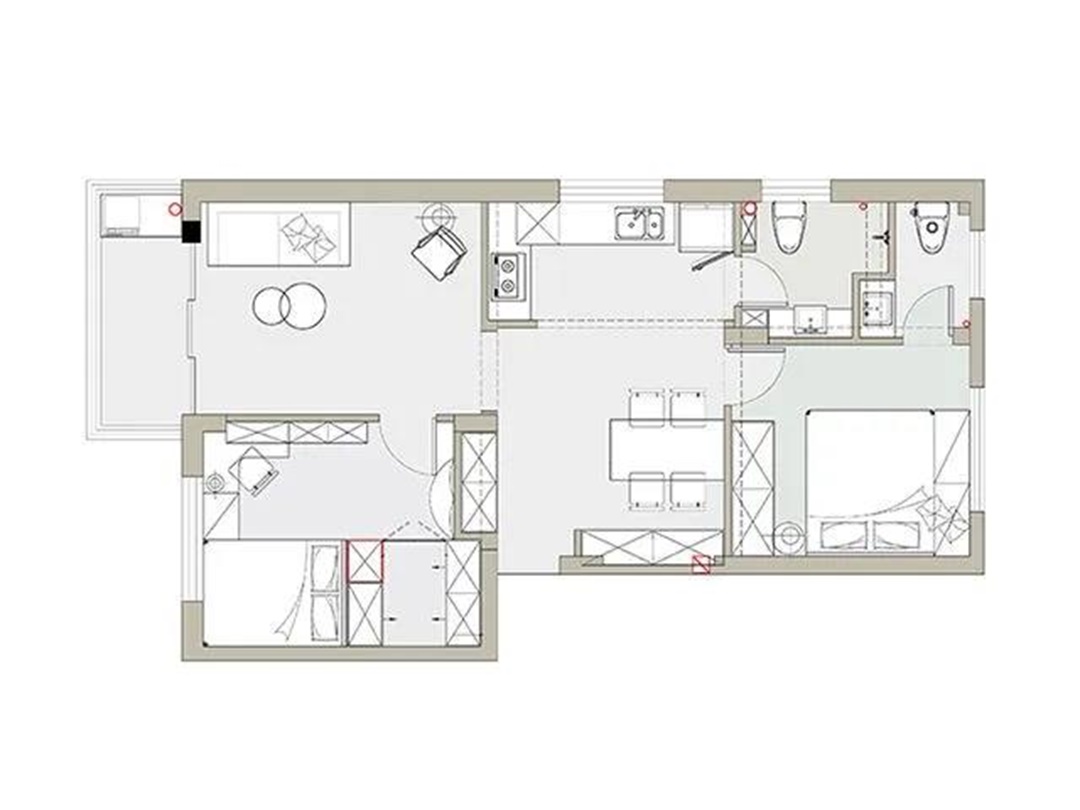 業主家的戶型比較通透,改造空間大。 如果設計三居室,房間就會有點擁擠,所以在次臥放置雙層床,供兩個女兒使用。在主臥分離出一個小的洗手間,方便女主人早上洗漱,同時與客用洗手間區分開來。