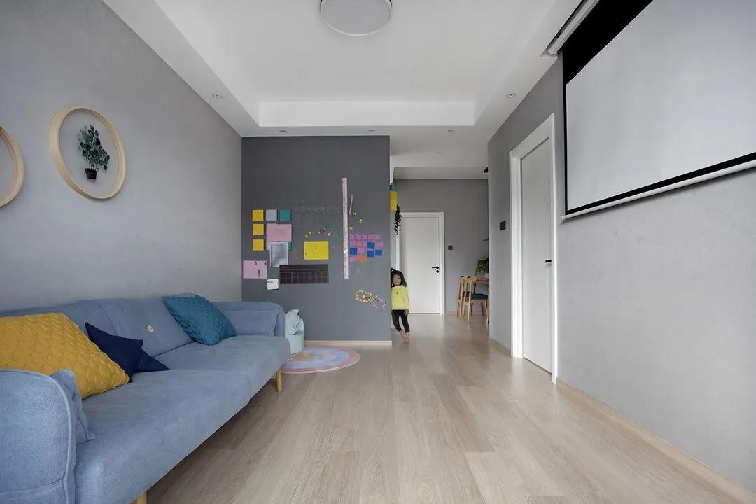 客廳的戶型比較修長,一字型沙發貼合墻壁,最為合適。沙發旁邊留一處小角落,供小朋友平時玩耍,是她看動畫片的小世界。