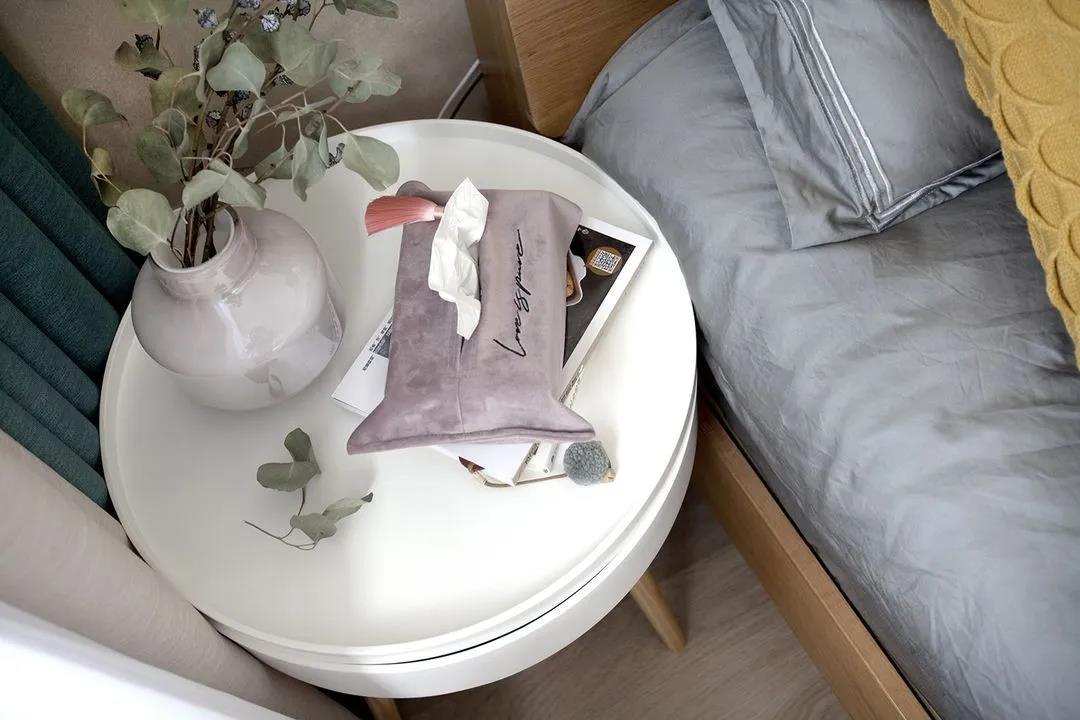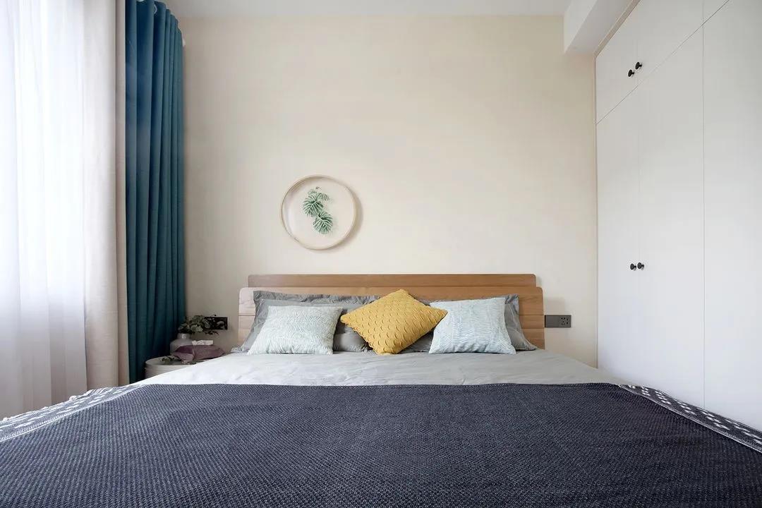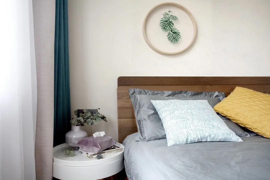 陽光微淡,歲月靜好,安然如素。臥室大繁至簡,大量用中性色卻十分溫馨。床頭背景墻用到柔柔的杏色,搭上綠植掛件,清新優雅。