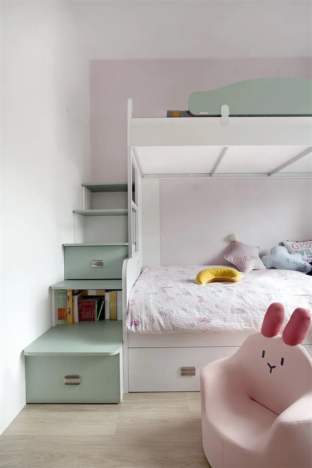 雙層床的的臺階可以翻開抽屜,方便小女孩收納書籍或小物件。床邊增添一個小小的衣帽間,從小培養孩子整理自己的禮物,做一個精致的女孩。