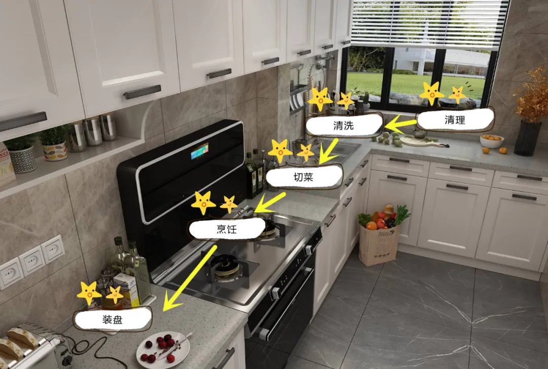 比如廚房,洗菜切菜炒菜視為合理的動(dòng)線,在空間面積有限但功能區(qū)不能減少的情況下,我們就要把使用頻率比不高的電器設(shè)置在高頻次使用的電器旁,來(lái)達(dá)到操作便利的最大化。