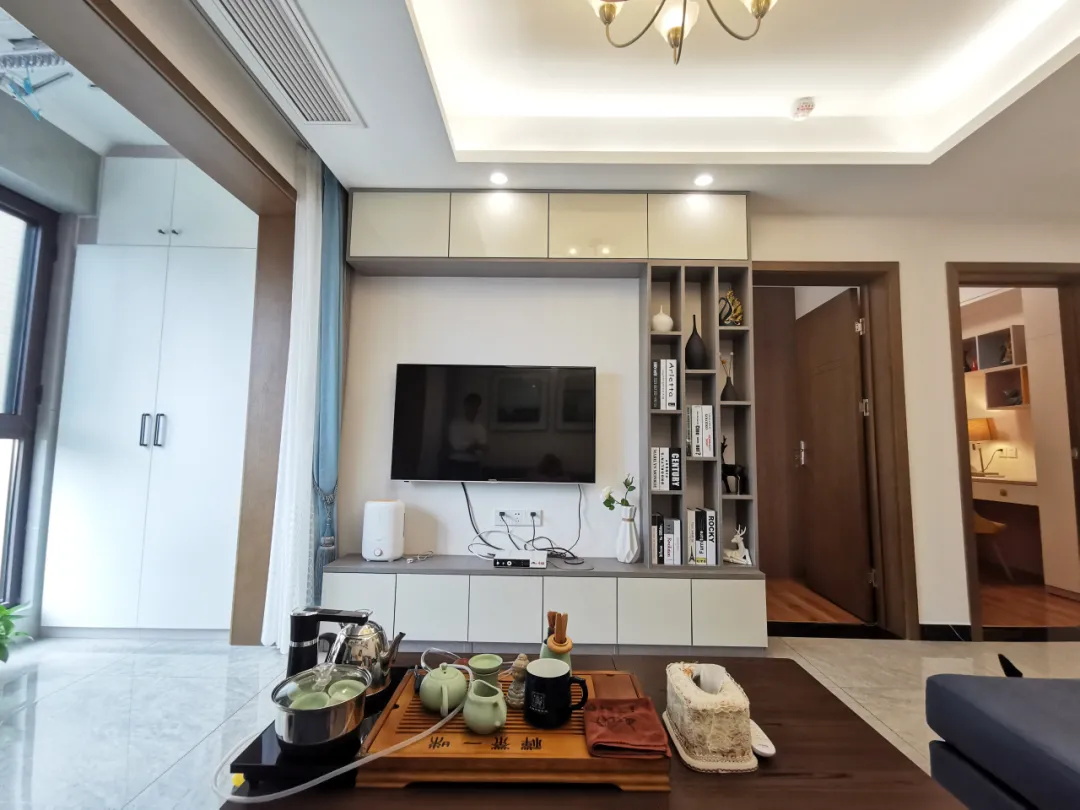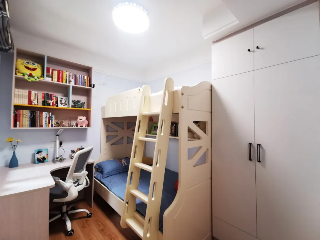 解決方案:把原主臥陽臺和客廳陽臺拆分,增加功能區;以灰白為主色調,降低空間的壓抑感;廚房做成L型設計,巧妙容納冰箱;通過上下鋪、榻榻米的設計,來增加空間的功能區和收納率。