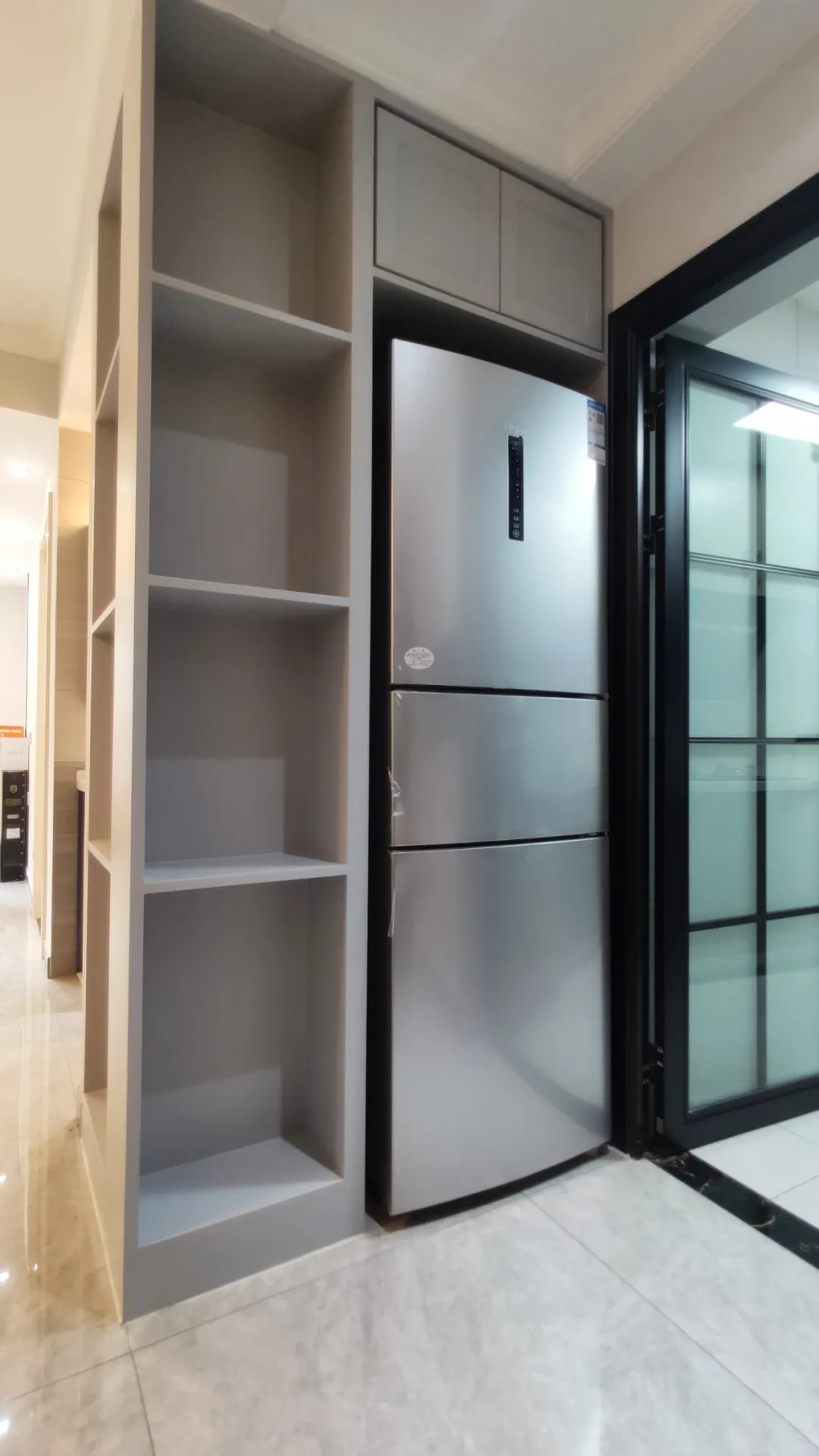 解決方案:砸掉廚房入戶門一側墻體做鞋柜,并利用廚房內側墻體做鞋柜的延伸,增加儲物;利用餐廳吊柜、水吧臺的落差嵌入冰箱。