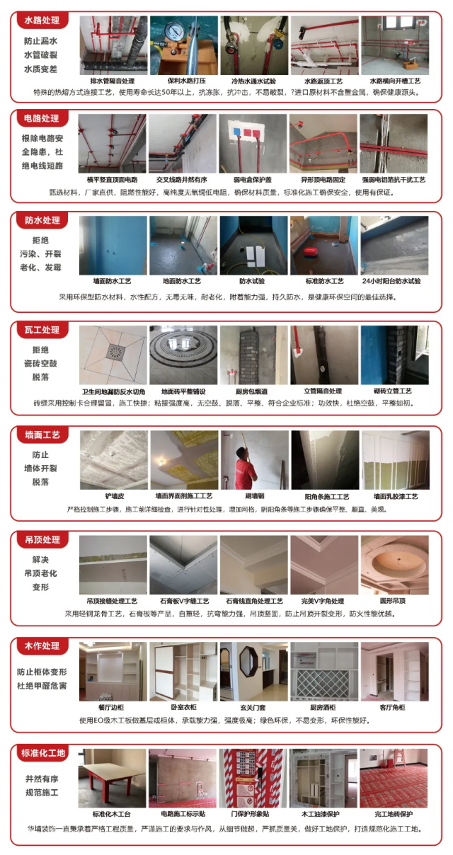 華埔裝飾承諾:我們選用的所有主材基材都是董事長親自考察洽談、總裁親自落地實施,環保級別高于國家級標準,假一賠十,高于市場價雙倍返差。我們是自有化工人,嚴格按照“綠金剛工程”108道工序標準化施工,給您超完美的裝修體驗。